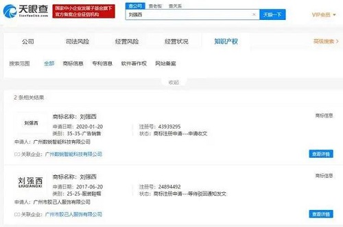 天眼查App顯示,“劉強西”和“章小天”已被注冊商標。今年1月,廣州數銳智能科技有限公司申請注冊“劉強西”的商標,商標國際分類為廣告銷售,該商標已于今年9月公示為“已注冊”。
