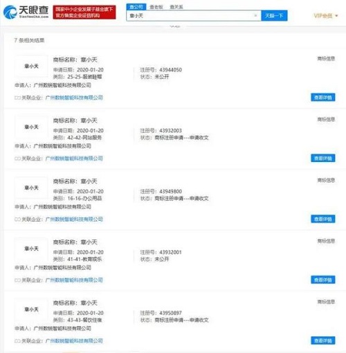 此外,廣州數銳智能科技有限公司還申請注冊了“章小天”的商標,商標國際分類涉及網站服務、辦公用品、教育娛樂、餐飲住宿、廣告銷售等,申請日期均在今年1月,商標狀態多數顯示為“已注冊”。