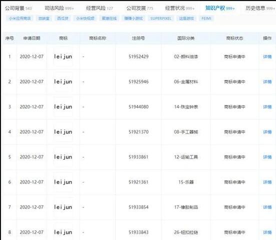 近日,小米科技有限責任公司新增多條“lei jun”商標信息,涉及國際分類包含金屬材料、運輸工具、樂器、珠寶鐘表等。申請日期為2020年12月7日。目前商標狀態為“商標申請中”。
