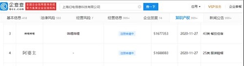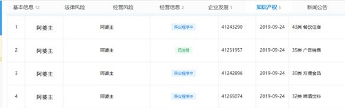 去年9月,就有餐飲公司拿到了“阿婆主”的商標(biāo),商標(biāo)分類是“廣告銷售”。