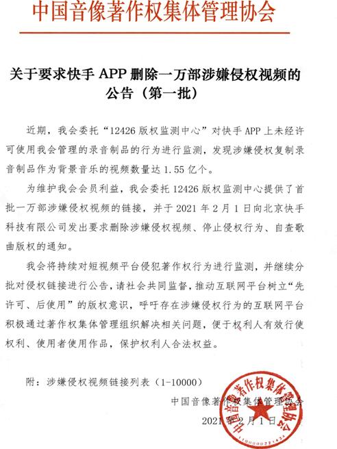 2月1日,中國音像著作權集體管理協會(下稱“音集協”)在官網披露了一則題為《關于要求快手APP刪除一萬部涉嫌侵權視頻的公告》,指出其近日委托“12426版權監測中心”對快手上未經許可使用音集協管理的錄音制品的行為進行監測,發現涉嫌侵權復制錄音制品作為背景音樂的視頻數量達1.55億個。