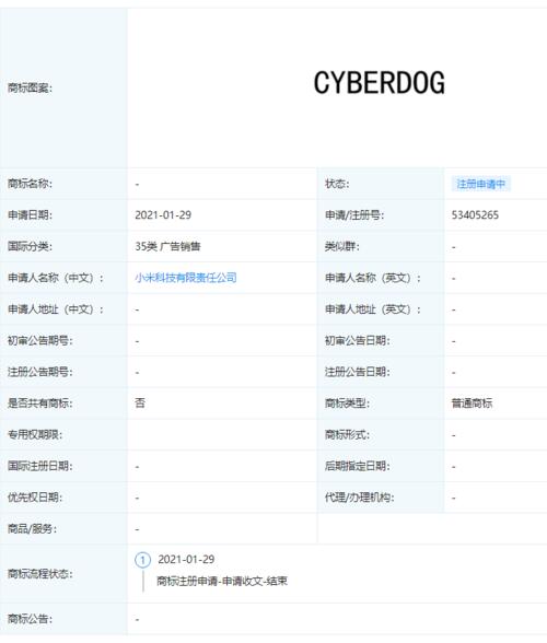 企查查APP顯示,小米科技有限責任公司于1月29日申請注冊CYBERDOG商標,其中國際分類包含35類廣告銷售、9類科學儀器等,目前商標狀態為注冊申請中。不過,與蘋果的用意不同,小米注冊這一商標似乎是用于廣告銷售或者醫療園藝的,而且商標的名稱全為大寫字母。
