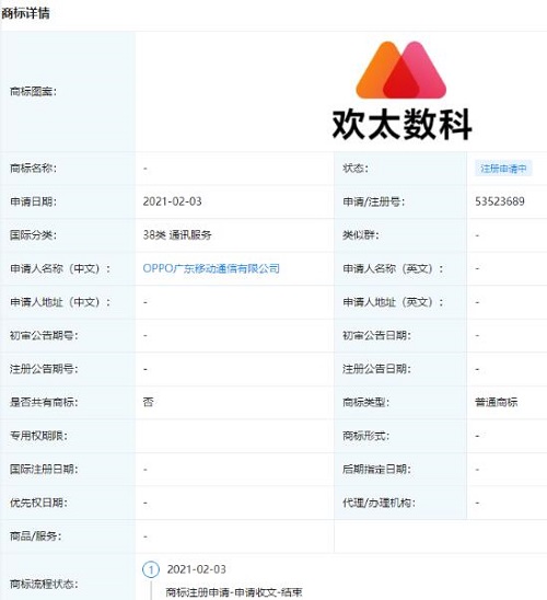 近日OPPO廣東移動通信有限公司申請注冊“歡太數科”商標,國際商標注冊分類為35類 廣告銷售、38類 通訊服務,商標狀態為“注冊申請中”。