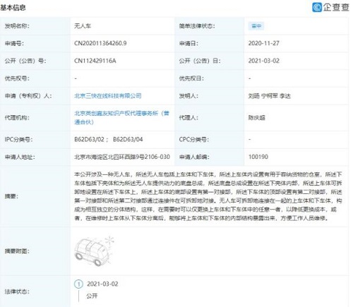 近日,北京三快在線科技有限公司公開一條“無人車”發明專利,公開號為CN112429116A。專利摘要顯示,本公開的目的是提供一種無人車,該無人車的更換成本低,維修方便。