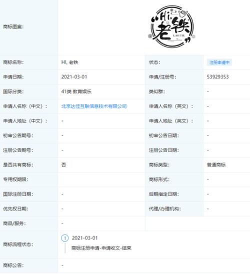 快手關(guān)聯(lián)公司北京達(dá)佳互聯(lián)信息技術(shù)有限公司申請(qǐng)注冊(cè)“Hi 老鐵”相關(guān)商標(biāo),商標(biāo)國(guó)際分類涉及教育娛樂(lè)品類,商標(biāo)狀態(tài)為“注冊(cè)申請(qǐng)中”。