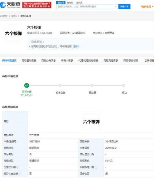 “六個核桃”山寨飲料“六個核彈”商標狀態為無效。該商標申請日期為2019年3月1日,國際分類為啤酒飲料,申請人尤丁樂。