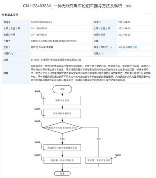 5月25日,華為技術(shù)有限公司公開“一種無線充電車位泊車推薦方法及系統(tǒng)”專利,公開號為CN112840388A。