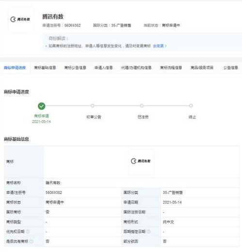 近日,騰訊科技(深圳)有限公司申請(qǐng)注冊(cè)“騰訊有數(shù)”商標(biāo),國(guó)際商標(biāo)分類為網(wǎng)站服務(wù)、廣告銷售等,目前商標(biāo)狀態(tài)多為“商標(biāo)申請(qǐng)中”。