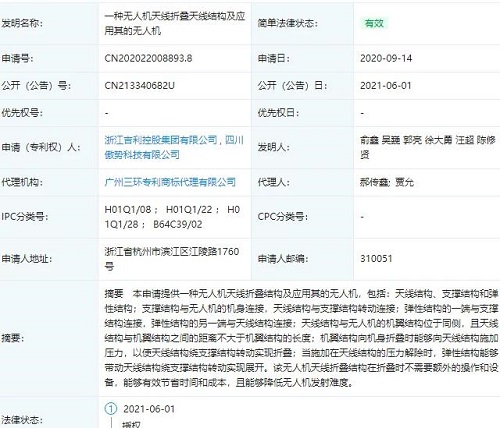 6月1日,浙江吉利控股集團有限公司獲得“一種無人機天線折疊天線結構及應用其的無人機”發明專利授權,公告號CN213340682U,申請日期為2020年9月,申請人為浙江吉利控股集團有限公司、四川傲勢科技有限公司。