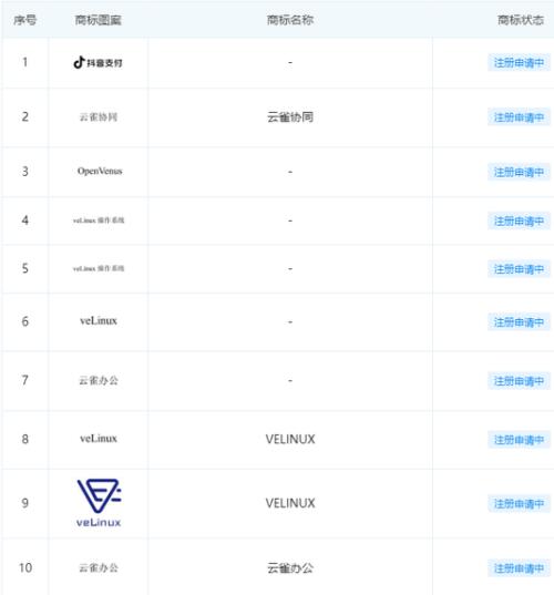 字節(jié)跳動(dòng)關(guān)聯(lián)公司北京字跳網(wǎng)絡(luò)技術(shù)有限公司于近日申請注冊veLinux操作系統(tǒng)、OpenVenus、云雀協(xié)同、云雀辦公相關(guān)商標(biāo)。