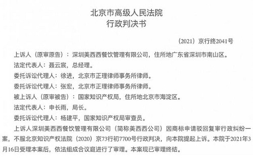 6月11日,北京法院審判信息網公開深圳美西西餐飲管理有限公司與國家知識產權局其他二審行政判決書,案號(2021)京行終2041號,審理法院為北京市高級人民法院,裁判結果為駁回上訴,維持原判。本判決為終審判決。