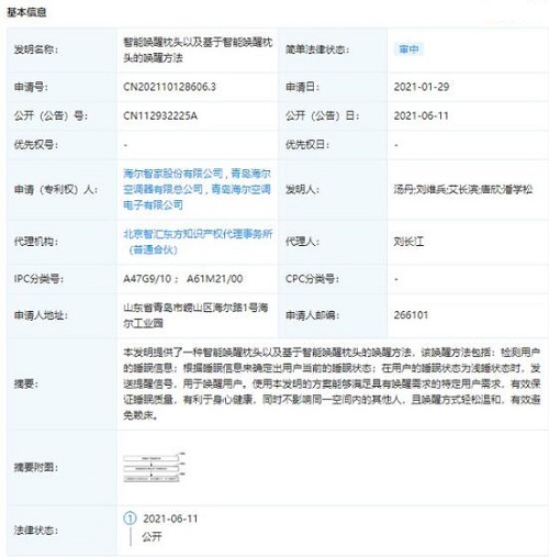 海爾日前公布了一項名為“智能喚醒枕頭以及基于智能喚醒枕頭的喚醒方法”的發明專利,專利公開號為CN112932225A。
