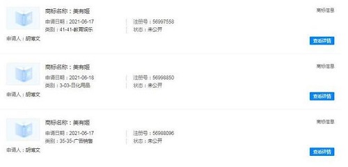 “美有姬”商標已被自然人胡某搶注,國際分類含廣告銷售、教育娛樂、日化用品,申請日期為2021年6月,當前商標狀態為申請中。