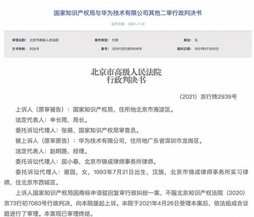 據(jù)北京法院審判信息網(wǎng)消息,7 月 13 日,國家知識產(chǎn)權(quán)局與華為技術(shù)有限公司其他二審行政判決書公開,案號(2021)京行終 2939 號,審理法院為北京市高級人民法院,裁判結(jié)果為駁回上訴,維持原判。
