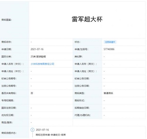 近日,小米科技有限責任公司申請注冊“雷軍超大杯”商標,國際分類涉25類 服裝鞋帽、16類 辦公用品等,目前商標狀態(tài)為注冊申請中。