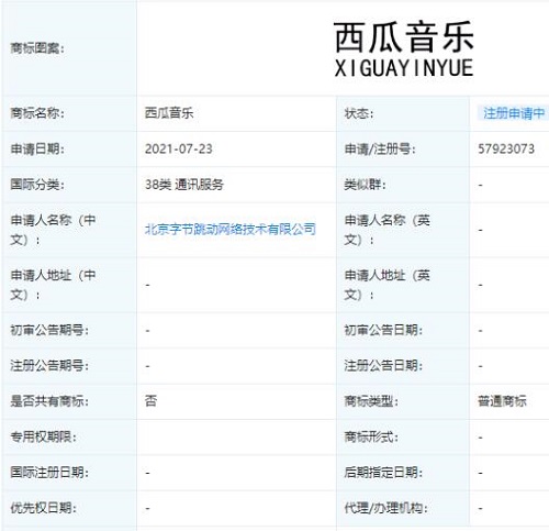 近日,字節跳動公司新增“西瓜音樂”商標申請信息,國際分類為通訊服務,目前商標狀態為“注冊申請中”。