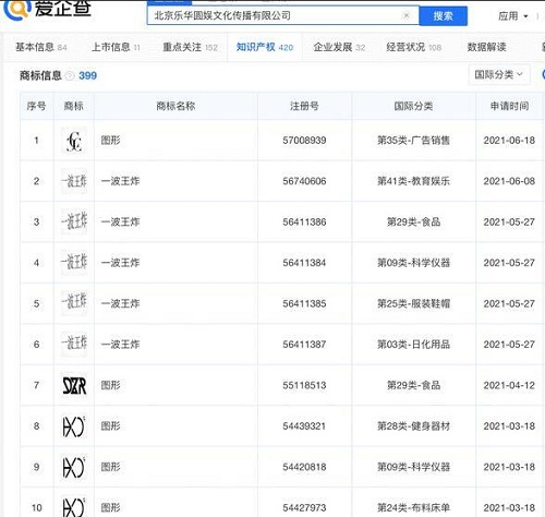 北京樂華圓娛文化傳播有限公司成立于2009年7月,法人代表杜華,注冊資本1.1億人民幣,經(jīng)營范圍包括組織文化藝術(shù)交流活動、技術(shù)推廣服務(wù)、投資咨詢等。商標(biāo)信息顯示,北京樂華圓娛文化傳播有限公司在2020年11月起已申請多個“一波王炸”商標(biāo),其中部分商標(biāo)還在注冊中。