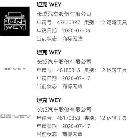 據報道,通過相關網站查詢到:長城汽車申請的坦克 WEY、坦克 400、坦克 500 和坦克 600 等商標,均處于商標無效狀態(tài)。