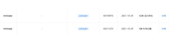 百度在線網絡技術 (北京) 有限公司申請注冊“ metaapp ”商標,國際分類涉及網站服務、科學儀器等。目前商標狀態均為申請中,申請時間是 10 月 29 日,也就是 Facebook 宣布改名的當天。
