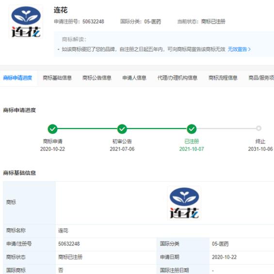 據天眼查App顯示,石家莊以嶺藥業股份有限公司已注冊100多個“以嶺”商標,涵蓋45個國際分類,最早的商標于2000年獲批。該公司申請的“連花”商標也有20多個已獲批注冊,國際分類涉及醫藥、醫療器械、日化用品等,最早的商標于2005年獲批。