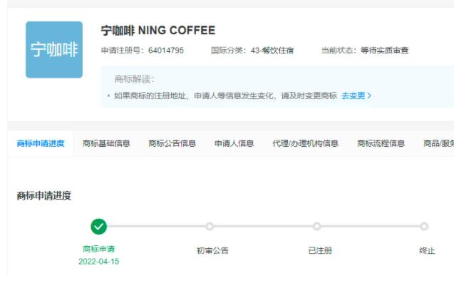 近日,李寧體育(上海)有限公司申請注冊“寧咖啡 NING COFFEE”商標,國際分類為餐飲住宿,當前商標狀態為等待實質審查。