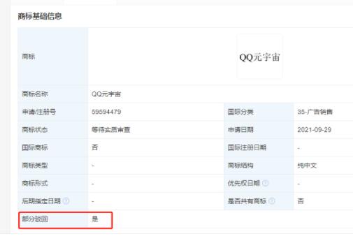 近日,騰訊科技(深圳)有限公司申請(qǐng)注冊(cè)的多個(gè)“QQ元宇宙”商標(biāo)狀態(tài)均變更為“駁回通知發(fā)文”。另外,該公司申請(qǐng)的“幻核元宇宙”“QQ音樂元宇宙”“光夜元宇宙”等多個(gè)元宇宙商標(biāo)也被駁回,以上商標(biāo)均申請(qǐng)于2021年9月。