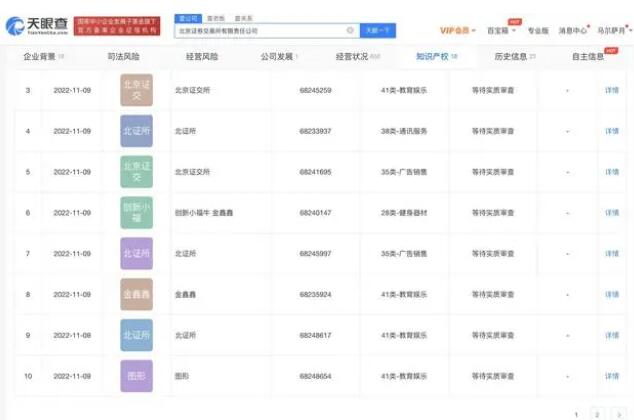 天眼查App顯示,近日,北京證券交易所有限責(zé)任公司申請(qǐng)注冊(cè)多個(gè)“北京證券交易所 BEIJING STOCK EXCHANGE”“北京證交所”“ 北證所”商標(biāo),國際分類包括通訊服務(wù)、教育娛樂等,目前商標(biāo)狀態(tài)均為申請(qǐng)中。