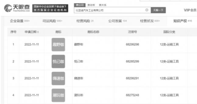 天眼查App顯示,近日,比亞迪汽車工業有限公司申請注冊“趣野咖”“悅己咖”“嗨速咖”“潮玩咖”商標,國際分類均為運輸工具,商標狀態均為申請中。