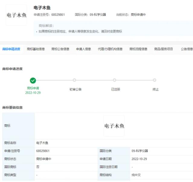 天眼查App顯示,合肥某網(wǎng)絡(luò)科技有限公司已申請(qǐng)注冊(cè)“電子木魚(yú)”商標(biāo),其國(guó)際分類(lèi)為科學(xué)儀器,申請(qǐng)時(shí)間為10月29日,當(dāng)前狀態(tài)為商標(biāo)申請(qǐng)中。此外,已有多家公司登記電子木魚(yú)相關(guān)軟件著作權(quán),包括“木魚(yú)軟件”“電子木魚(yú)軟件”等。