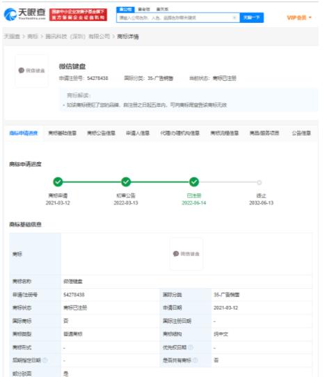 天眼查App顯示,騰訊科技(深圳)有限公司曾多次申請“微信鍵盤”商標(biāo),其中去年3月申請的多枚商標(biāo)已成功注冊,今年3月再次申請的多枚商標(biāo)狀態(tài)為“駁回復(fù)審中”。此外,騰訊公司還于近日申請注冊多個“微信輸入法”圖形商標(biāo),國際分類涉及科學(xué)儀器、教育娛樂、通訊服務(wù)等,當(dāng)前商標(biāo)狀態(tài)均為等待實(shí)質(zhì)審查。